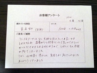 しかし、心地良く受けられ、気持ちよく起きられました。